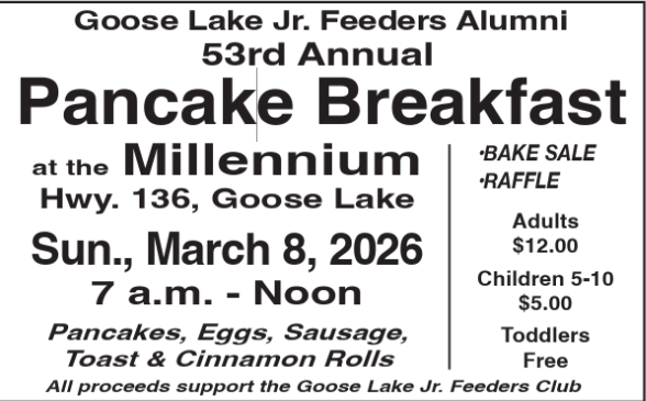 Goose Lake Jr Feeders Pancake Breakfast March 4, 2026 Paul Dymkowski Event Details Date: March 8, 2026 7:00 AM – 12:00 PM Venue: Millennium Ballroom Categories: Events