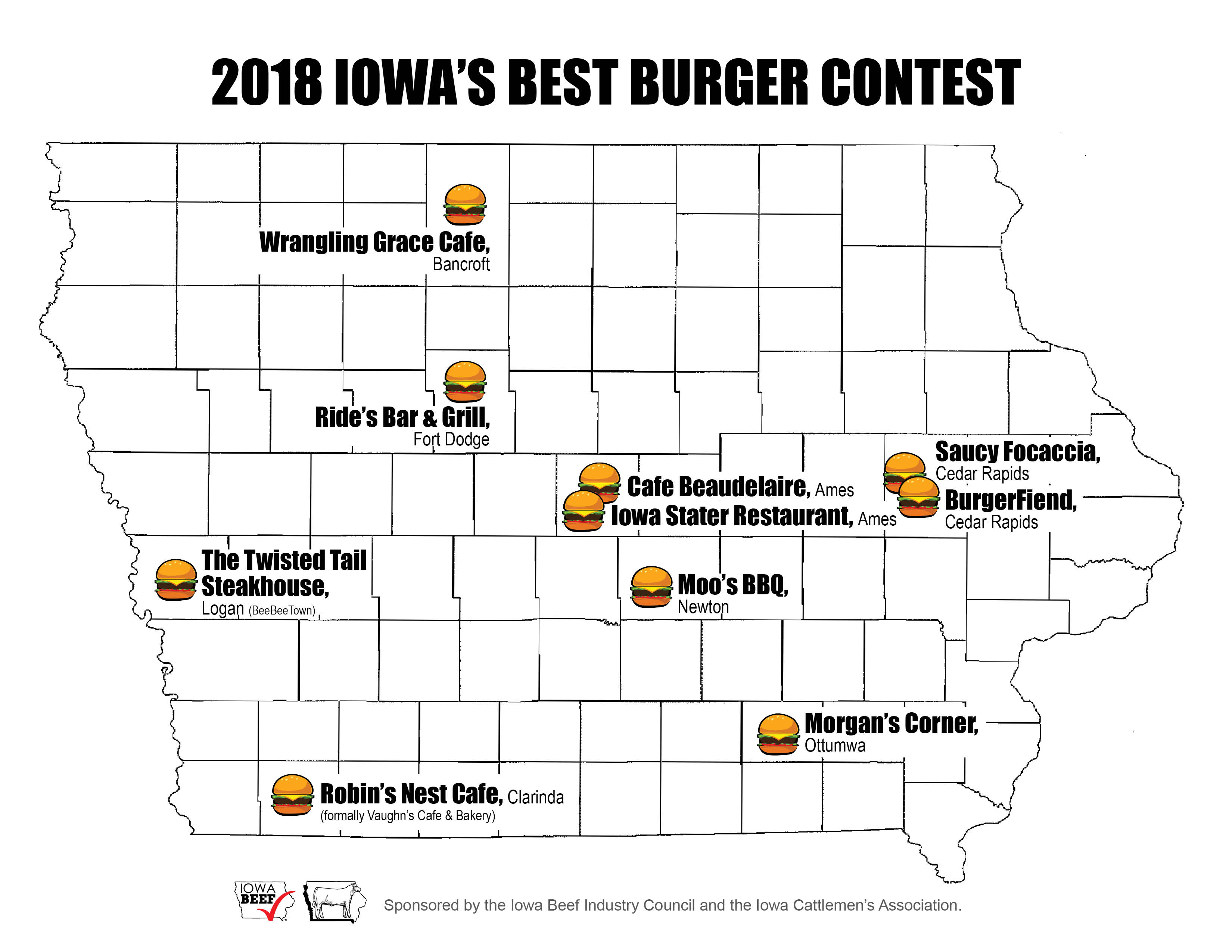 Seven restaurants are new to the contest’s Top 10 list and include: BurgerFiend, Cedar Rapids; Cafe Beaudelaire, Ames; Iowa Stater Restaurant, Ames; Moo’s BBQ, Newton; Morgan’s Corner, Ottumwa; The Twisted Tail Steakhouse, Logan; and Wrangling Grace Cafe, Bancroft.