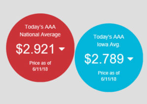White says gas is averaging $2.79 a gallon in Iowa or about 13 cents below the national average. That price is a drop of three cents from last week — but the cost is still 53 cents higher than one year ago when a gallon of gas cost $2.26.