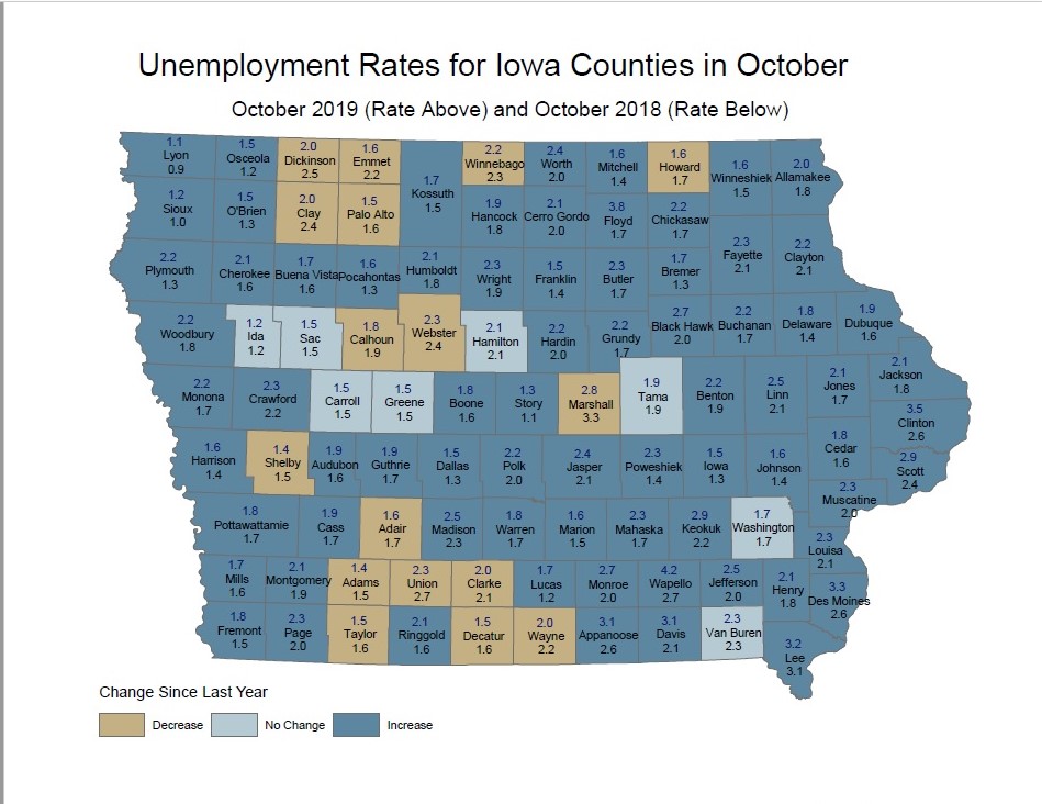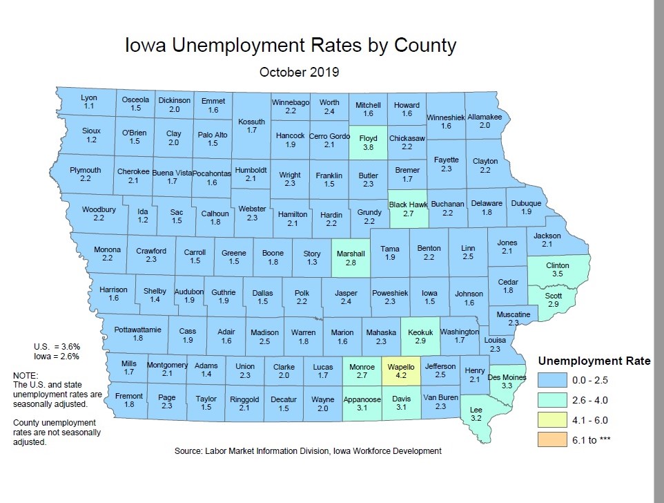 Clinton County unemployment rate in October was the same as September at 3.5 percent. In Clinton the rate dropped from 4.2 percent in September to 4.1 in October. Local date from IWD: Oct 2019 (pdf)