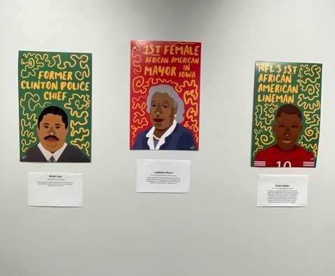 In her artist narrative, artist Hayley Calvin writes, “This display highlights some influential African American who have contributed profoundly to Clinton Iowa as well as some individuals who have made Black History through their achievements. I think it is important for people to realize the rich and amazing history that Clinton has. My hope is that this display will help encourage people, this Black History Month to look into the life stories, historical contributions, and achievements of these individuals.”