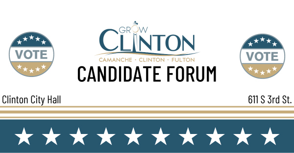 Matt Parbs, Vice President of Community & Economic Development at Grow Clinton, stated, “The candidate forum provides an opportunity for City of Clinton and City of Camanche residents to make an informed decision come Election Day. The forum will focus on key issues impacting our city and our city’s future.”