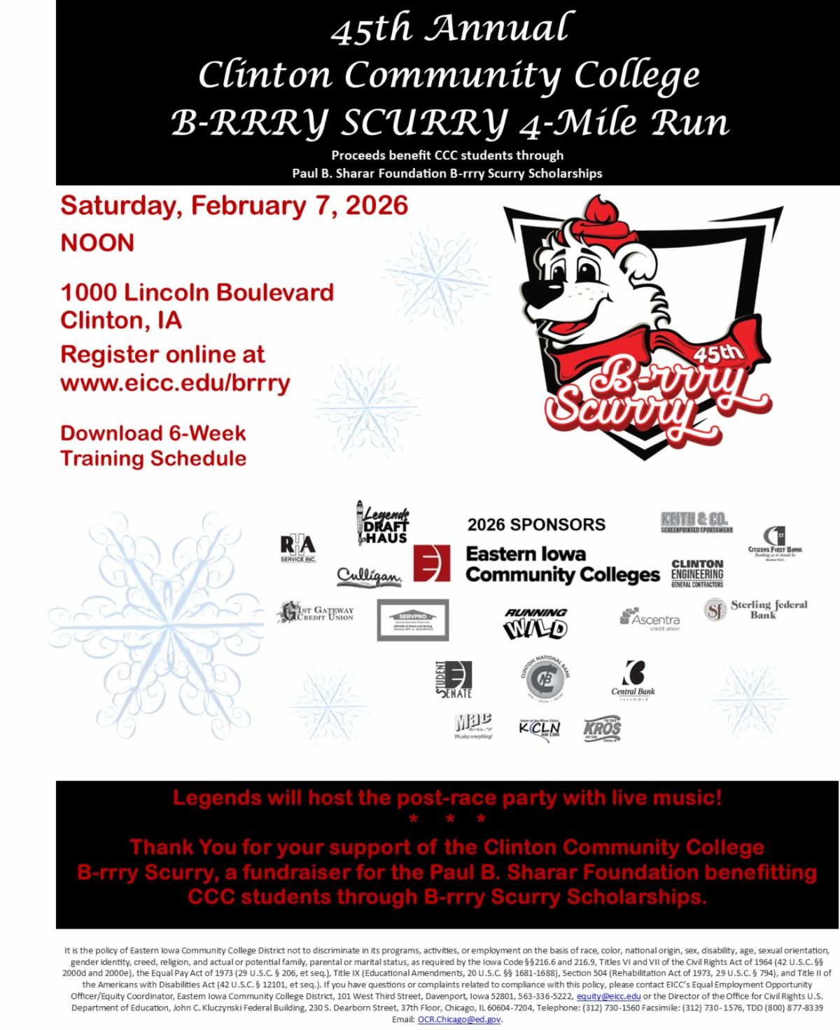 CLINTON, IA – Clinton Community College will host the 45th Annual B-rrry Scurry 4-Mile Run on Saturday, February 7, 2026. Runners and walkers love the B-rrry Scurry race day atmosphere! The route is flat and fast with chip timing and instant results. For year, participants have called the B-rrry Scurry “one of the best little races in the Midwest!” Proceeds of the race benefit CCC students through B-rrry Scurry scholarships. Registration is available at www.eicc.edu/brrry or stop in to CCC, 1000 Lincoln Blvd., Clinton, to pick up a form.