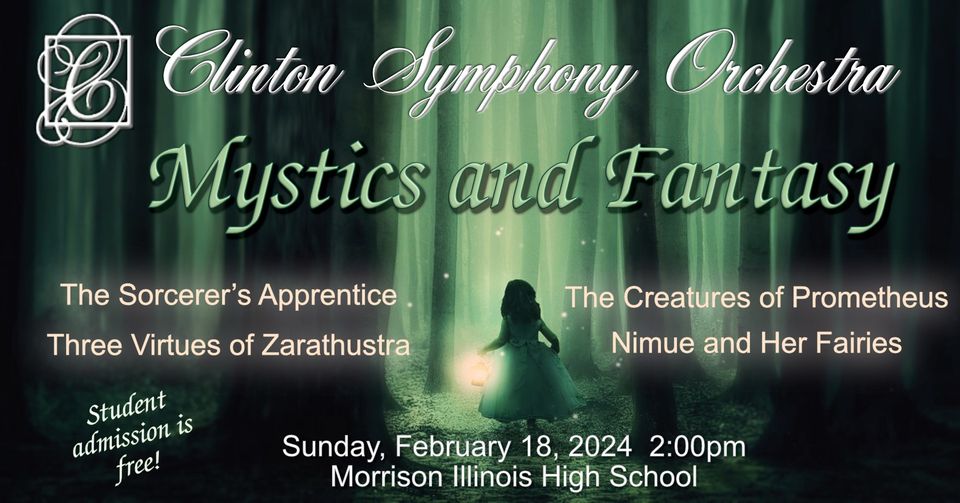 “Mystics and Fantasy” is the theme for Clinton Symphony Orchestra’s annual Family Concert. Set for 2:00 p.m. Sunday [Feb. 18], in the Morrison High School auditorium, the program will open with French composer Paul Dukas’ “The Sorcerer’s Apprentice,” which inspired the Disney movie of the same name.
