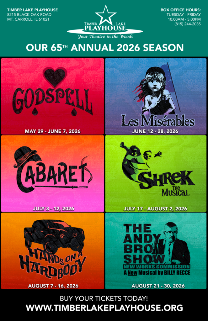 For 65 years, Timber Lake Playhouse has welcomed generations of theatergoers to its wooded hillside outside Mount Carroll, where stories unfold beneath open skies and applause echoes through the trees. The 2026 season celebrates that legacy with a vibrant mix of beloved musicals, dynamic storytelling, and continued investment in new work.