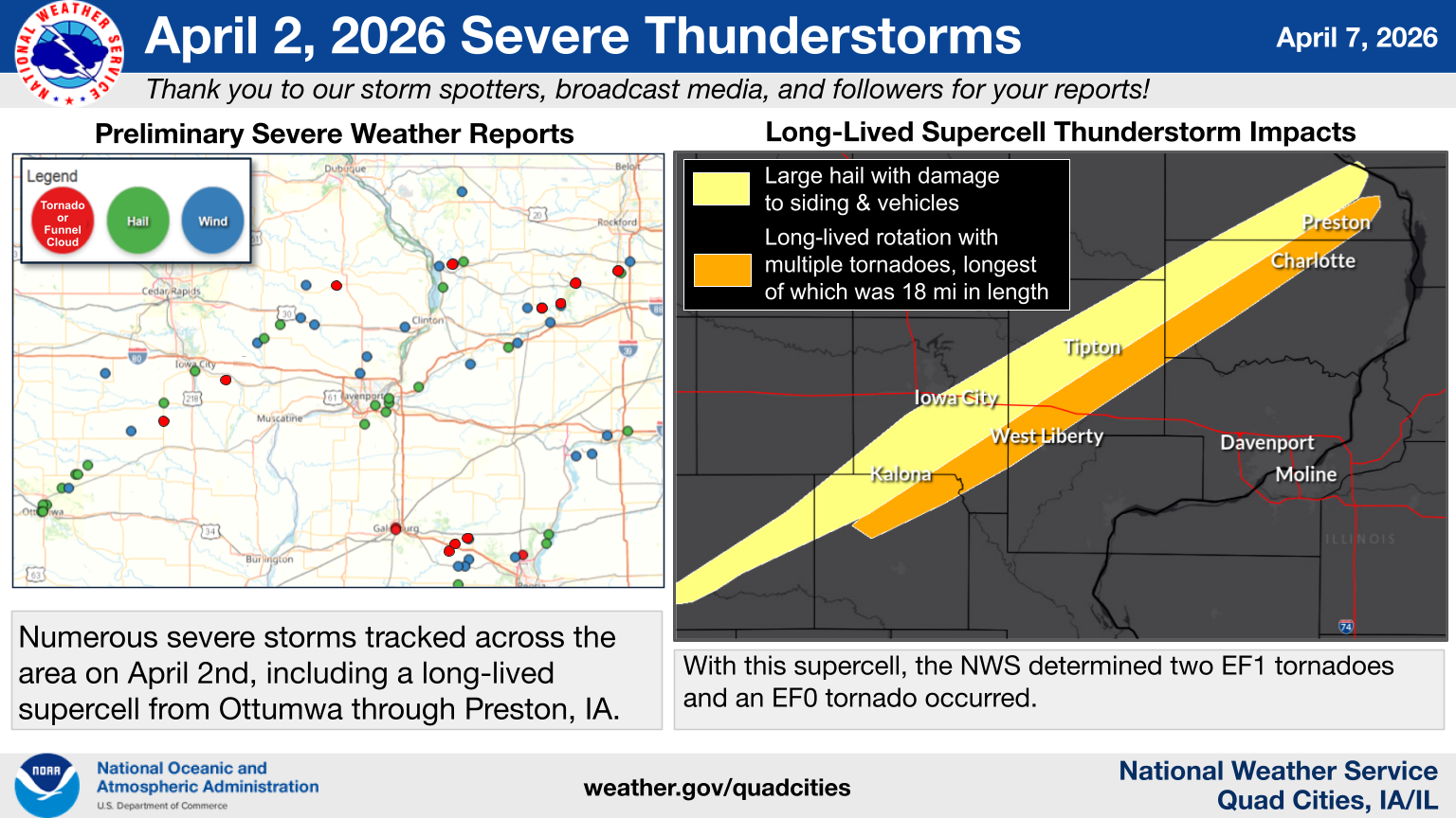 Preston, Iowa. The National Weather Service has completed its damage surveys from the April 2 severe weather event. Meteorologists found six tornadoes caused damage across the area, including an EF-1 tornado in Preston, Iowa.